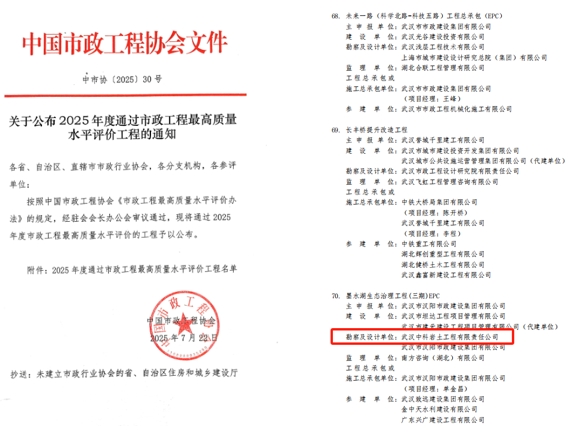 近日,武汉中科岩土工程有限责任公司参与的墨水湖生态治理工程(三期)项目,获得“2025年度市政工程最高质量水平评价”。作为承担本项目岩土工程详细勘察工作的单位,我们深感荣幸与责任。这一荣誉不仅是对项目勘察工作的认可,也将激励我们在岩土工程领域持续精进,以更高标准践行专业担当。